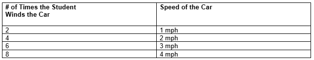 A student wants to test the relationship between the speed and energy of an object.So, the student winds up a toy car with a complete turn and records the speed the car travels in the table below. If the relationship between the energy of an object and the speed of the object continues the pattern above, how many times would the student wind the car to get it to go 5 mph?
