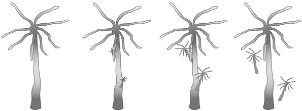 Hydra reproduce by a process known as budding, as shown in the diagram below. This process is the formation of a new individual that is a clone of the parent.