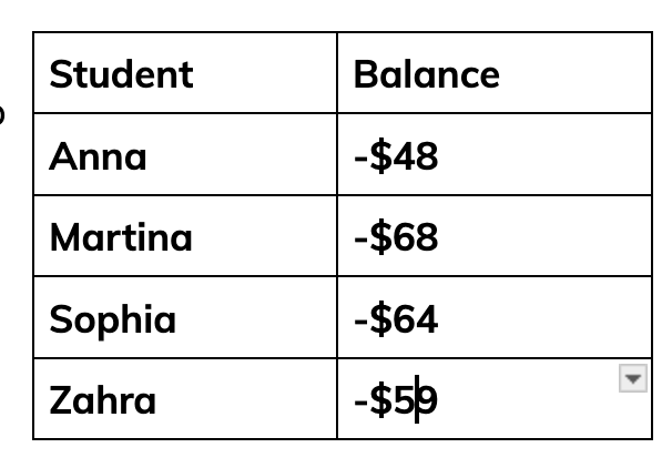 Anna -$48, Zahra -$59, Sophia -$64, Martina -$68