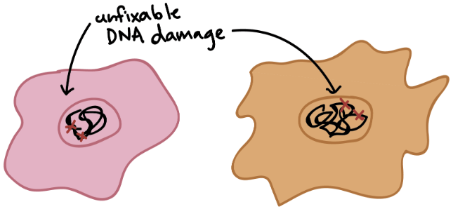 Both of these cells have DNA damage. Why does only one of them become cancerous?