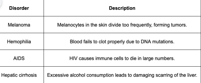 Based on the descriptions provided, which disorder most directly relates to malfunctions in the cell cycle?