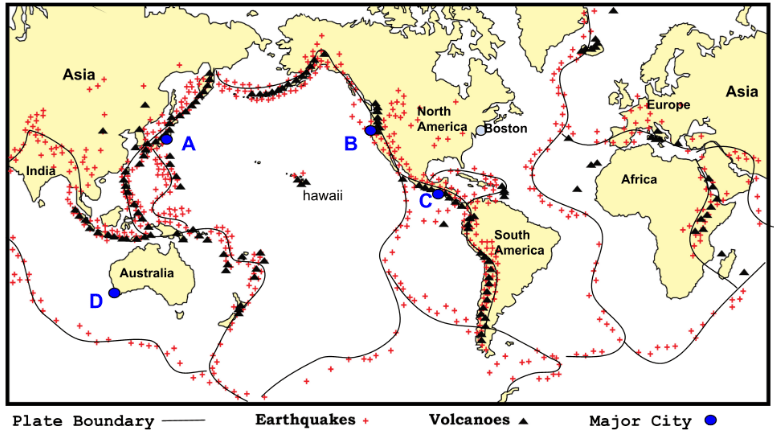 E = City D is located in the middle of a tectonic plate, away from boundaries, volcanoes, and earthquakes.