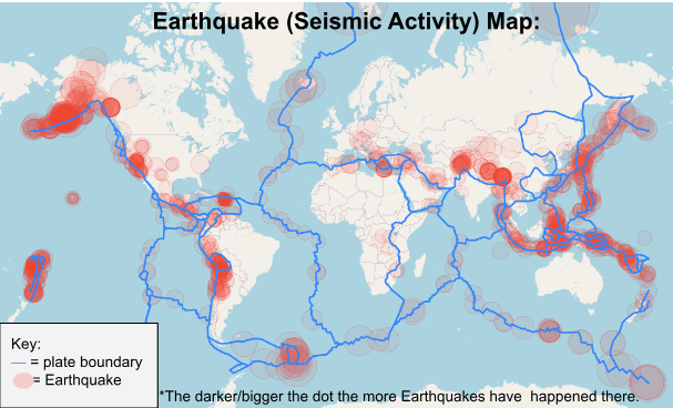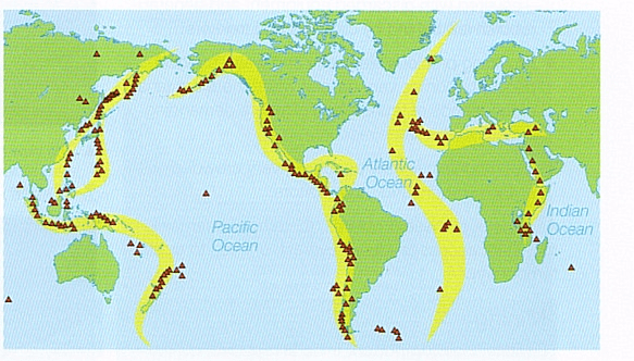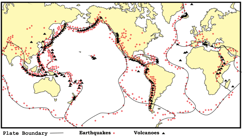What pattern/ trend do you notice about the location of earthquakes and volcanoes on this map?