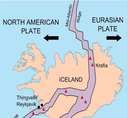 The key has been removed from this map.  The red triangles represent volcanoes.  Based on this information, predict what the yellow lines represent.