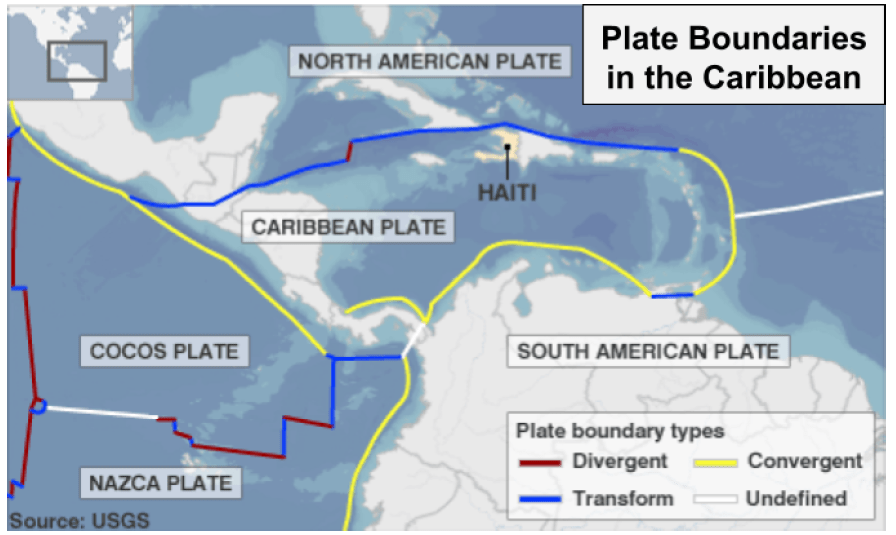 Haiti is located along a transform plate boundary.  Earthquakes happen when tectonic plates are trying to slide past one another, get stuck, and then suddenly move releasing massive built up pressure.