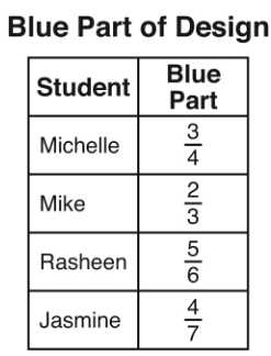 Michelle and her friends made a mosaic pattern in art class with colored tiles. This chart shows the fractional part of each student’s design that was blue.
