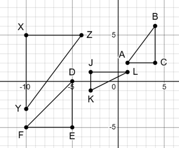 Triangle XYZ and Triangle TUV are congruent triangles. Triangle XYZ has coordinates X(1, 2), Y(-3, -5), Z(2, -2). Triangle TUV has coordinates U(-10, 4), V(-5, 7). Find the coordinates of T(x, y) that would make the triangles congruent.