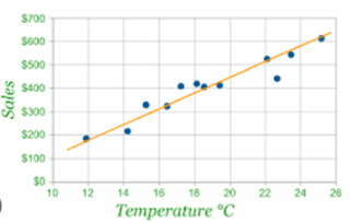 According to the line of best fit, approximately how much would sales be when temperature is 18 degrees?