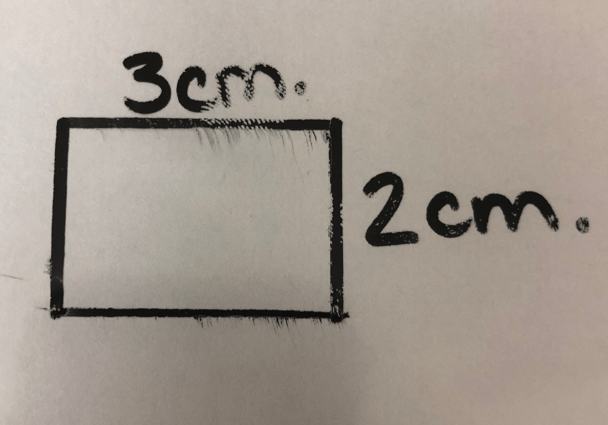 This rectangle is 3 cm. long and 2 cm. wide. What is the area of the rectangle?