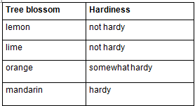 Some tree blossoms are hardy. That means they can survive temperatures close to 0 ºC. Others are not hardy. They are easily hurt by the cold. The table shows the hardiness of different tree blossoms.