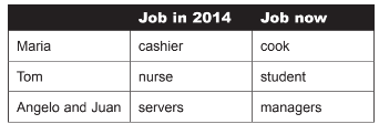answers may vary:server, busperson, cashier, cook, electrician, nurse, nursing assistant, construction worker, restaurant manager, teacher, receptionist, doctor, painter, salesperson, carpenter, gardener, childcare worker, auto mechanic, housekeeper, custodian, pharmacy technician, factory worker, hairstylist, dental assistant