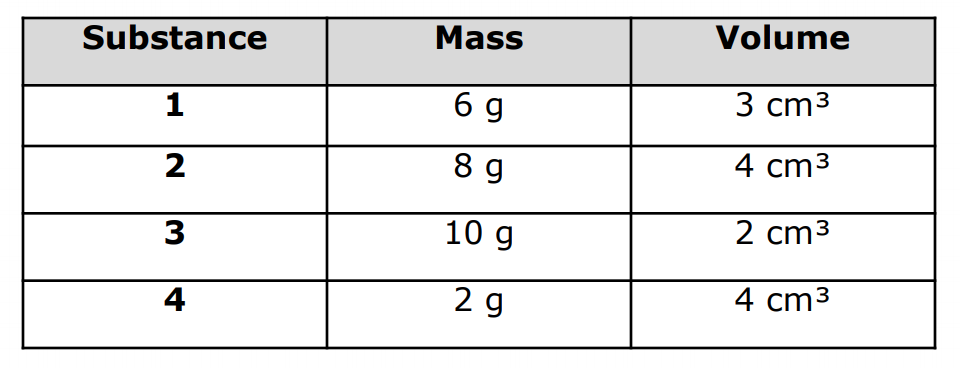 A student performs an investigation to determine the density of an unknown sample. The student drops the 10g sample into a graduated cylinder with 30 mL of water. The water rises to 35 mL. Based on the densities of the substances below, what is the most likely identity of the sample?