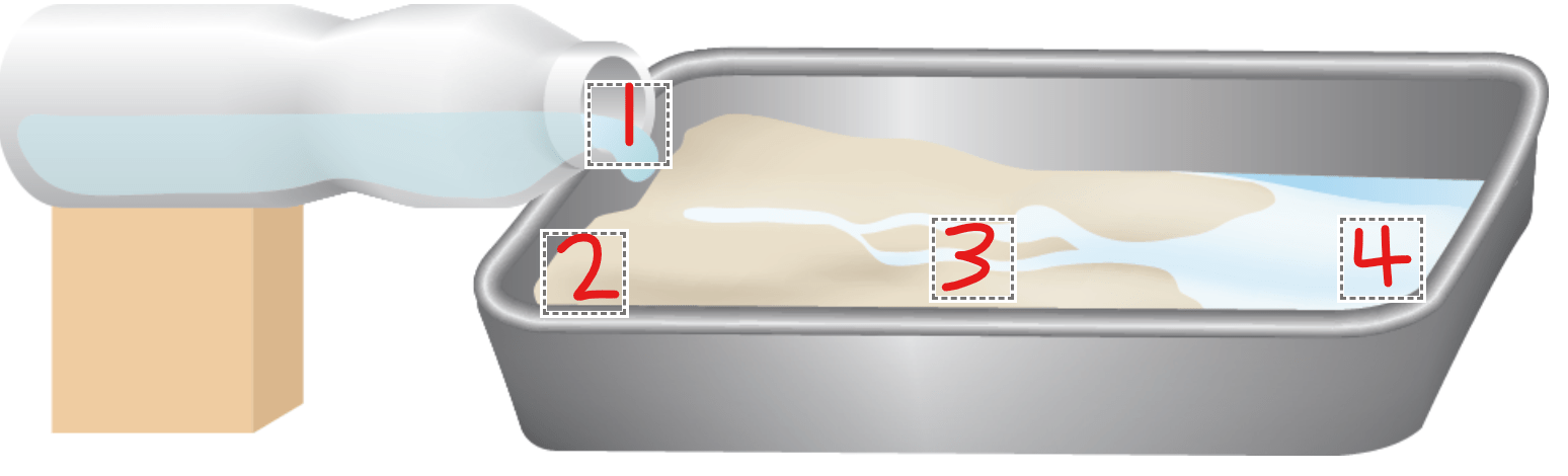 Vincent set up the model below using a bottle of water, a baking pan, sand, and a block to hold the bottle. Select the spot that models erosion to the land.