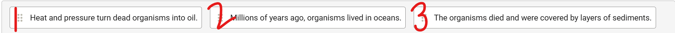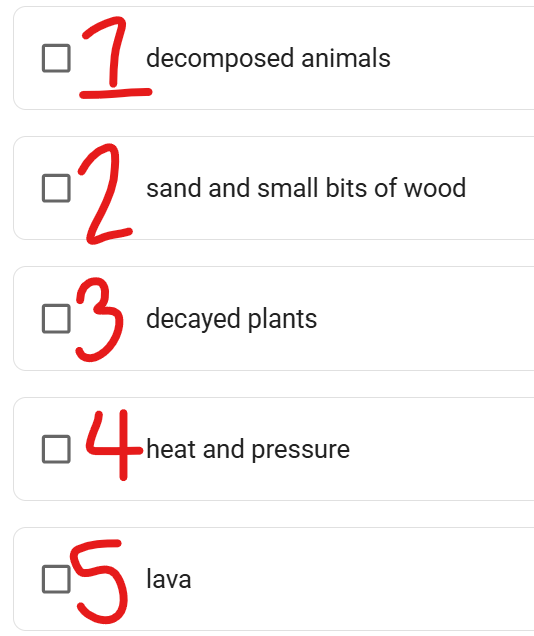 Students in Mrs. Ramirez's class were studying the formation of fossil fuels. Mrs. Ramirez gave them the steps of fossil fuel formation and asked them to put them in the correct order. What is the correct order of fossil fuel formation? write the numbers in order.