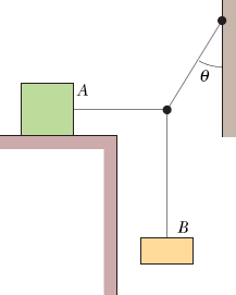 In the figure, block A (mass 10 kg) is in equilibrium, but it would slip if block B (mass 5.0 kg) were any heavier. For angle θ = 30 degrees, what is the coefficient of static friction between block A and the surface below it?