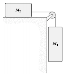 A mass (M1 = 5.0 kg) is connected by a light cord to a mass (M2 = 4.0 kg) which slides on a smooth surface, as shown in the figure. The pulley (radius = 0.20 m) rotates about a frictionless axle. The acceleration of M2 is 3.5 m/s2. What is the moment of inertia of the pulley?