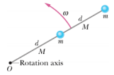 In the figure, two particles, each with mass m1 = 0.85 kg, are fastened to each other, and to a rotation axis at O, by two thin rods, each with length d = 5.6 cm and mass M = 1.2 kg. The combination rotates around the rotation axis with angular speed of 0.3 rad/s. Measured about O, what is the combination's kinetic energy?