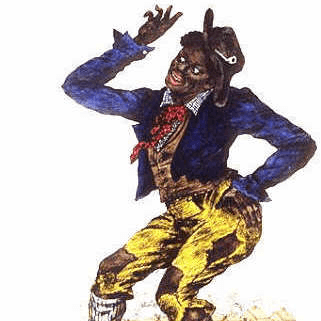 This stereotypical black man was a dancing entertainer and white men would dress up in black face like him in shows to humiliate the facial features of black men.
