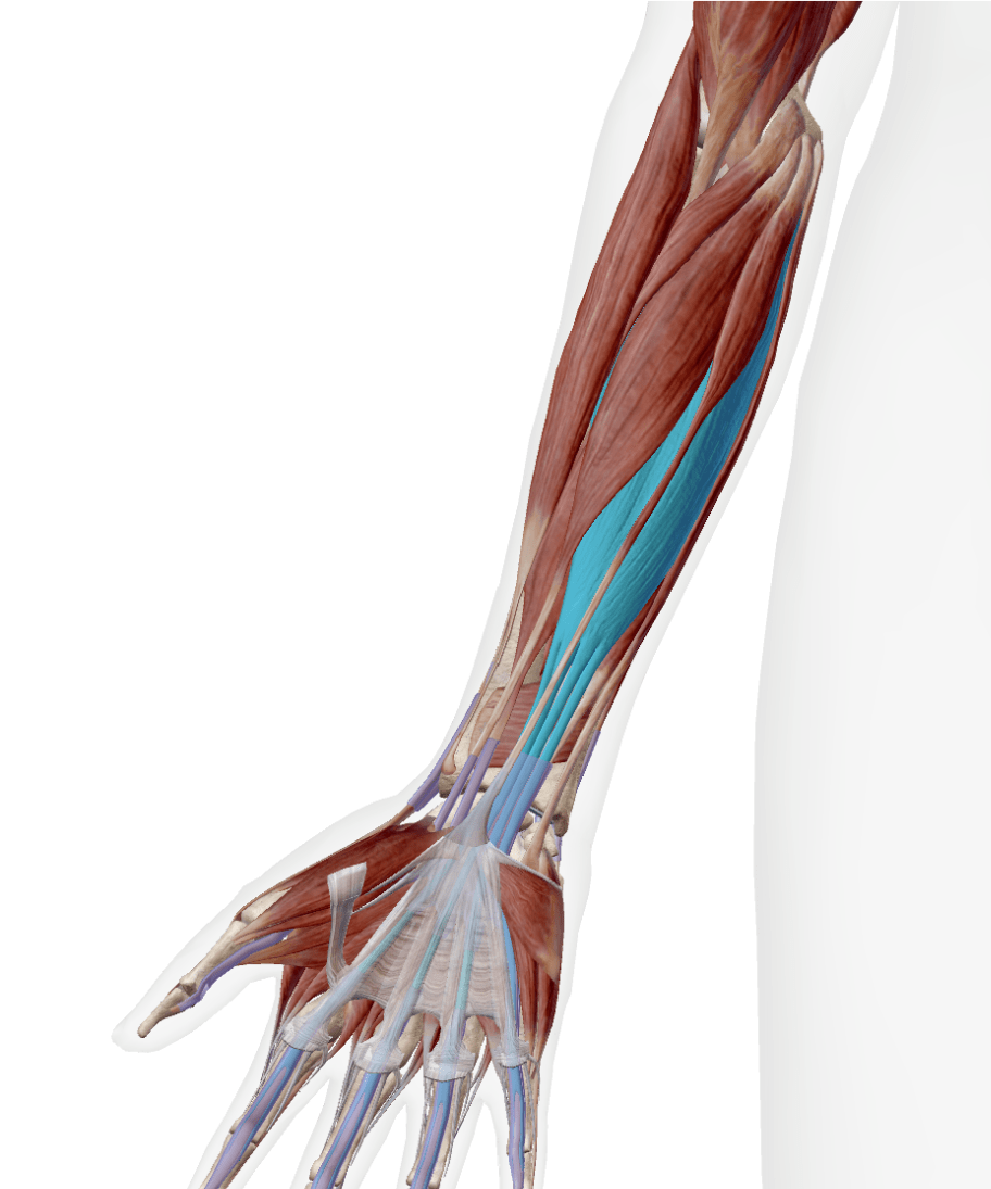 Anterior forearm muscle that moves the fingers and bends the wrist.