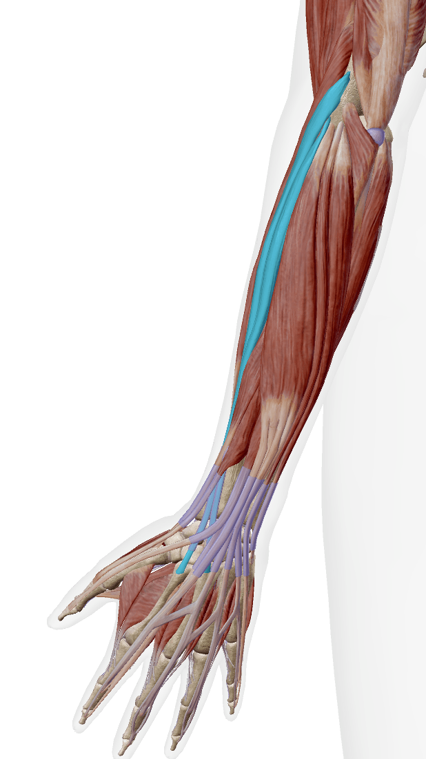 This muscle moves the wrist and fingers and is on the posterior side of the forearm.
