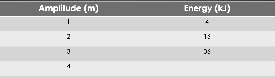 As amplitude doubles, energy quadruples. Find the missing energy number.