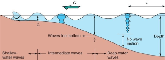 Draw a continuous picture showing deep water wave formation, intermediate wave formation, and shallow water wave formation.