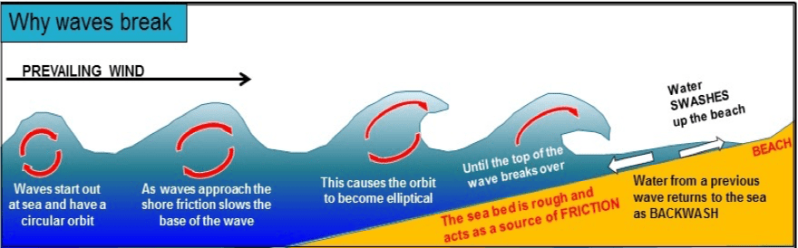 Depth of Water: Shallow depth = More interaction with sea floor/friction = Waves more easily produced