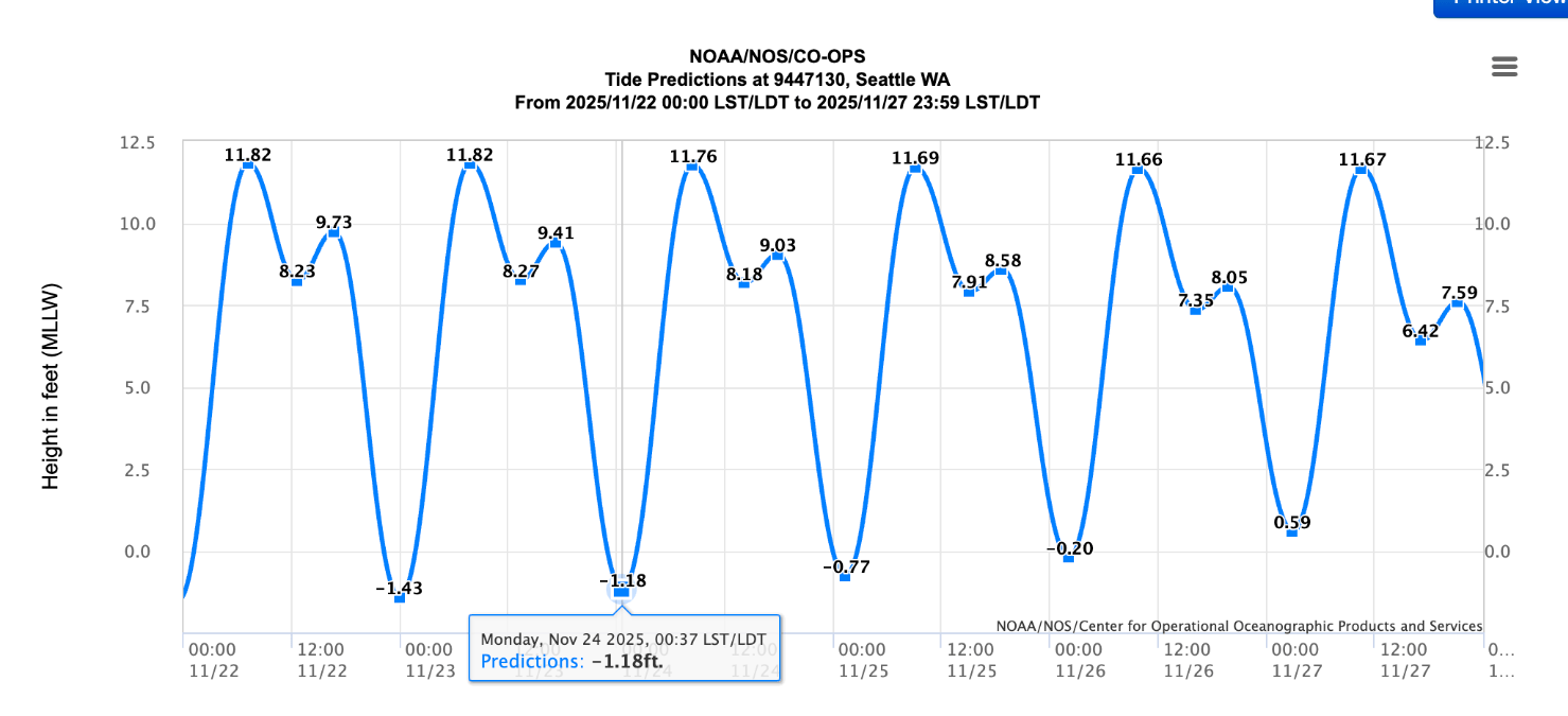 The 11/23 low tide is lower but doesn't happen until 1:30pm/13:30!