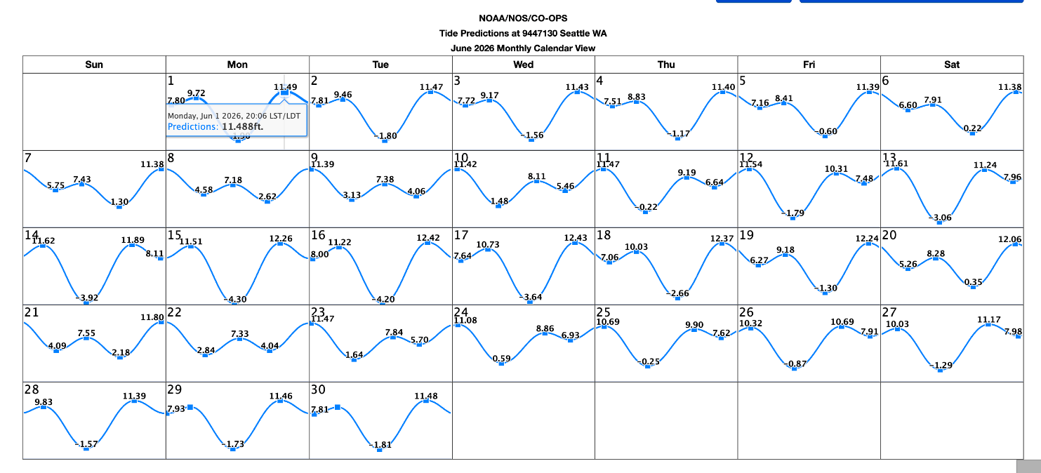 You have landed your boat on shore after a 12 foot tide back in May. Unfortunately, you forgot to take your boat back out to sea with the receding tide. When is your next chance to take your boat back out to sea based on the tide chart.