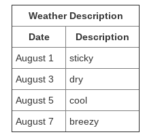 Romeo asked 10 teachers on four different days to describe the weather using one word. The top selection for each day is shown in the table.
