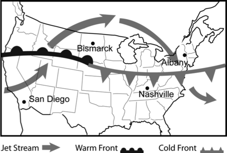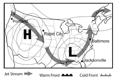 The Jet Stream is a global pattern of atmospheric movement that influences patterns in local weather. Based on the information provided in the weather map, which city shown will most likely experience a drop in pressure over the next few days?