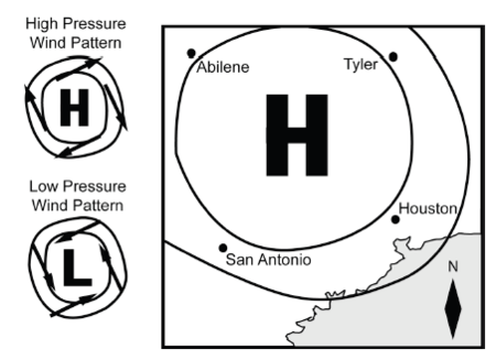 The general pattern of winds around a high pressure area is clockwise, outward. Based on the information provided, which Texas city shown will most likely have winds from the east?