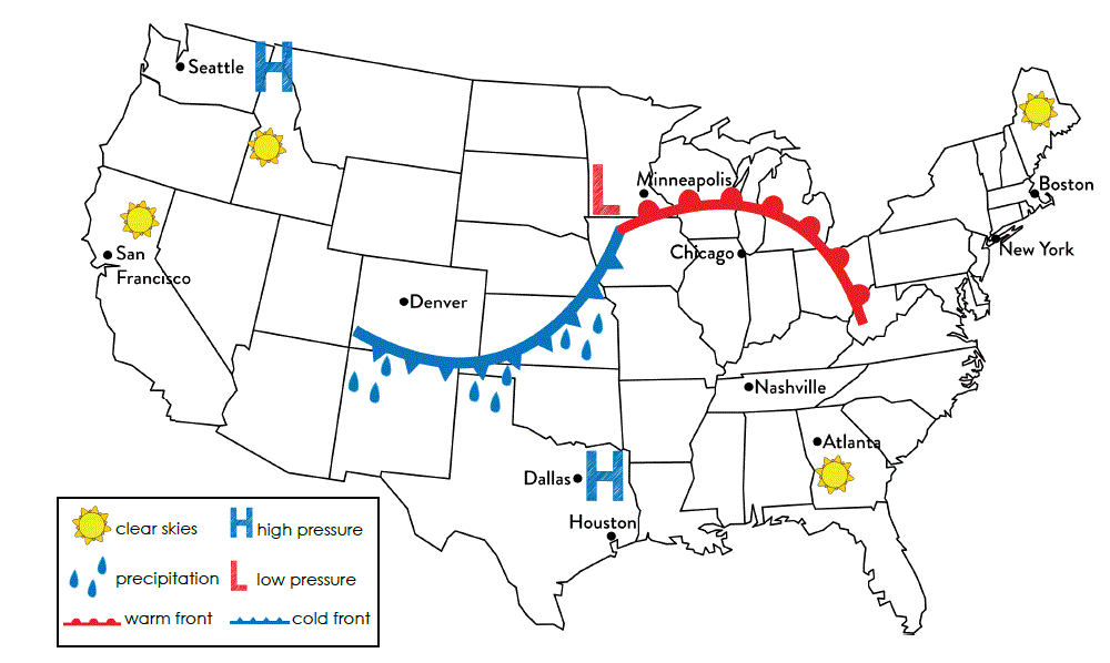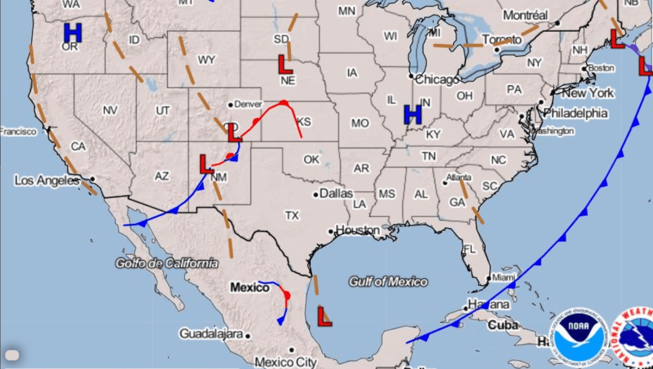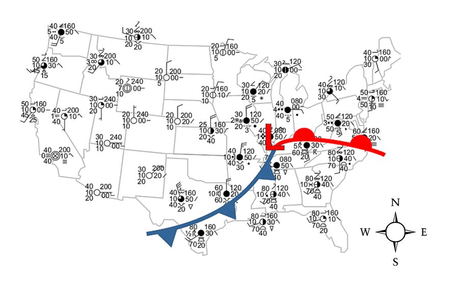 What direction is the cold front moving on the map?