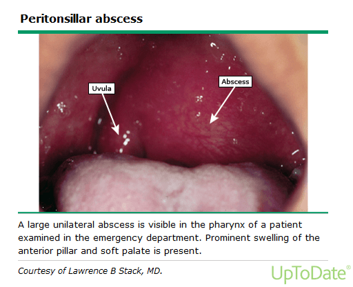 What are: muffled voice, drooling, uvula deviation, trismus, soft palate fullness.