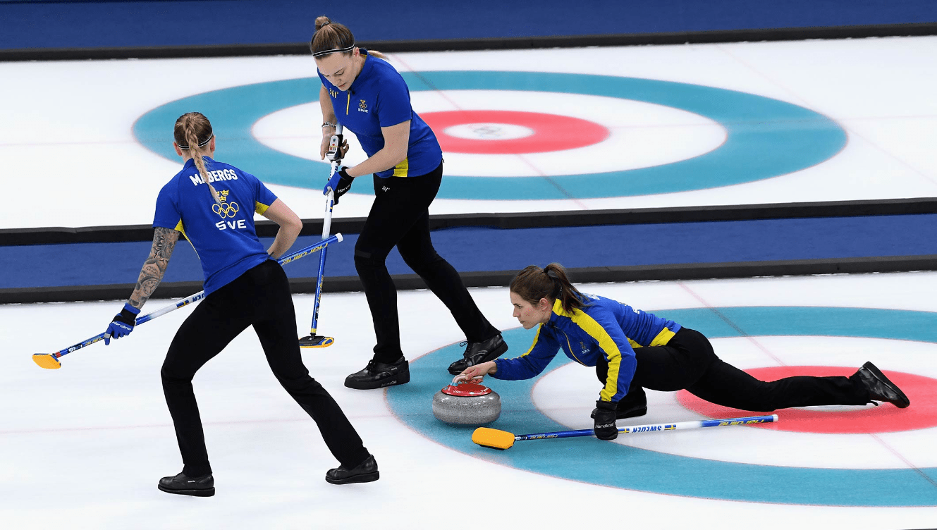 Which icy pastime slides a polished stone toward a house while teammates sweep?