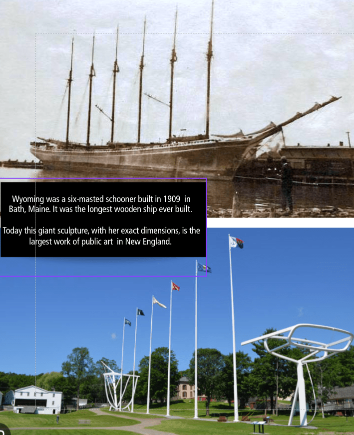 This six-masted schooner, once the largest wooden sailing vessel built in the United States, is commemorated by a full-scale “ghost ship” sculpture at the Maine Maritime Museum in Bath, tracing her full 450-foot length.