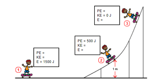 1: PE = 0 J, KE = 1500 J