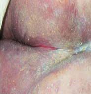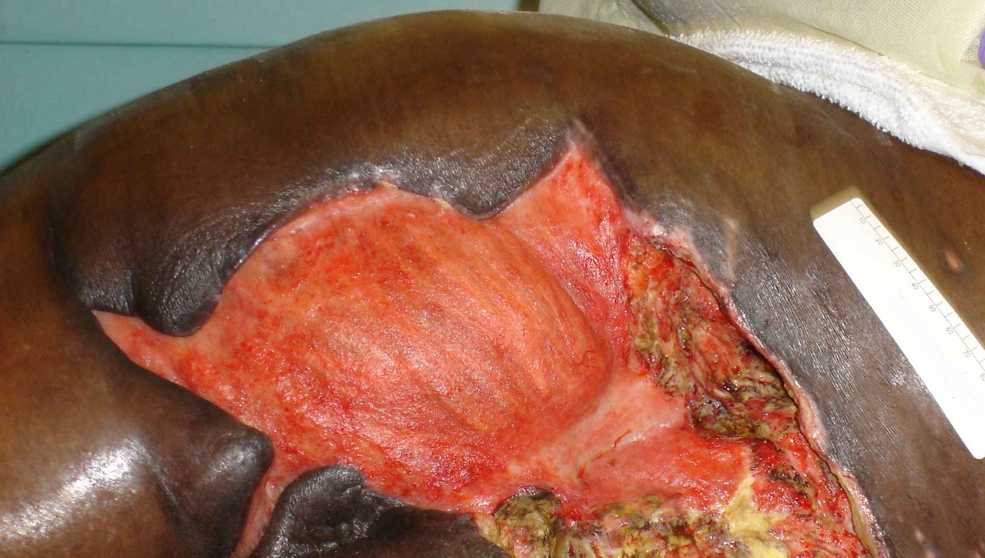 An open area over a bony prominence in which muscle is visible.