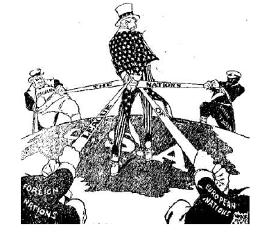 What opinion concerning America's role in intercontinental warfare was expressed in the cartoon above?