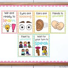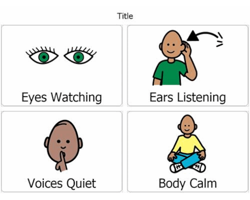 Student shows quiet, ready body. Calm posture, eye contact, sitting/standing still.