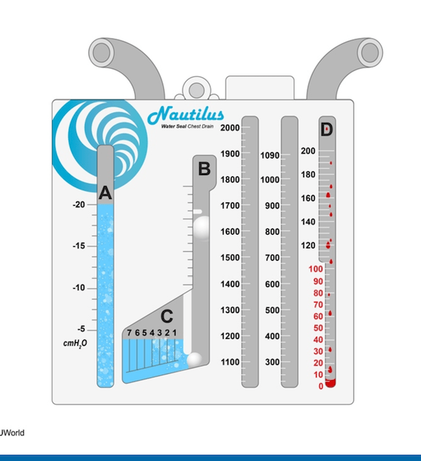 the nurse is caring for a client involved in a mvc who had a chest tube inserted to evacuate a pneumothorax caused by fractured ribs. where would the nurse observe an air leak?