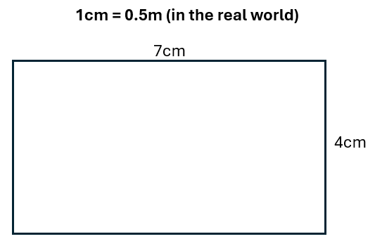 If the particular room shown below measures 7cm by 4cm, what would the actual area of this room be (in the real world).