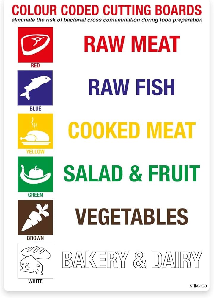 What colour cutting board should be used for cooked meats?