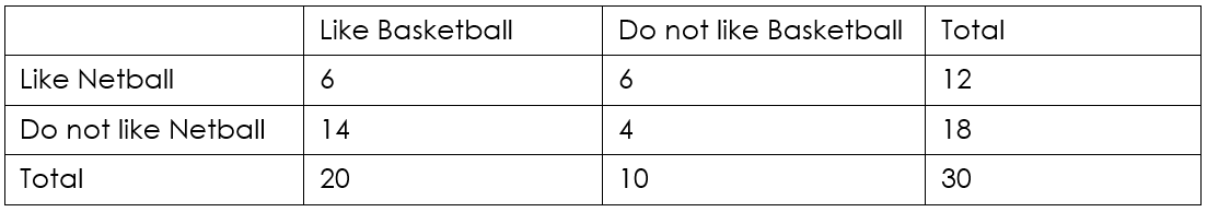 Using the below 2-way table, what is the probability that a student does not like Netball?