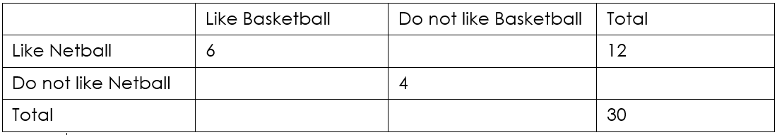 The following 2-way table shows the number of students who like and dislike basketball and netball. Complete the following 2-way table.