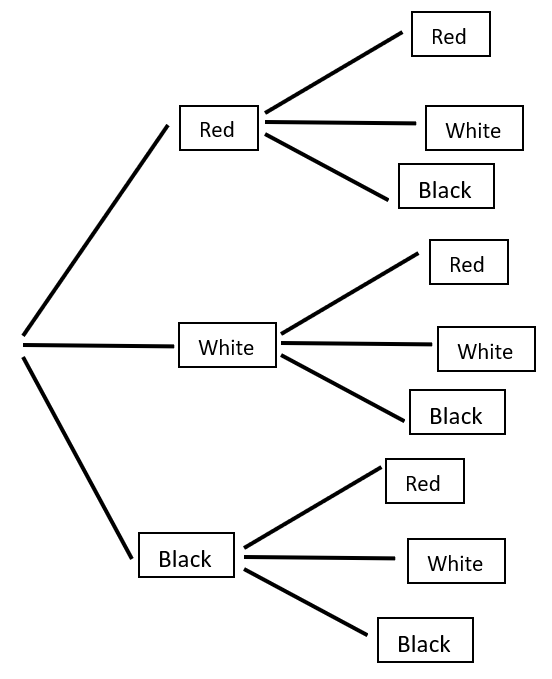 You have been selected to pick 2 colours from a bag. Inside the bag has 3 colours, Red, White and Black. After you pick a colour, you will replace the colour you select. Draw a tree diagram reflecting this 2-step experiment.