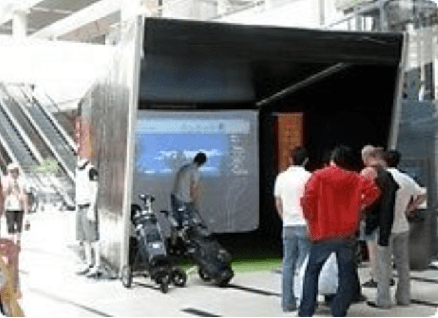 Golf simulator. Kan spille alt fra 9-18 hullers baner og smækkes op lige hjemme i garagen.