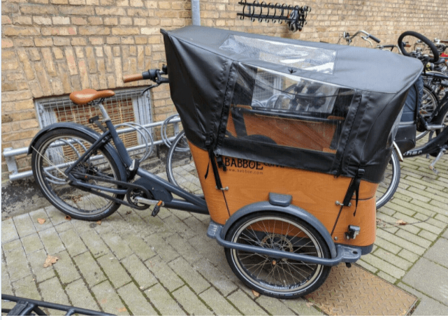 Ladcykel. Inklusiv babysæde og hjemmestrikkede handsker. Den kører som en drøm og kan transportere selv de mærkeligste børn til skole eller christianshavn gym.