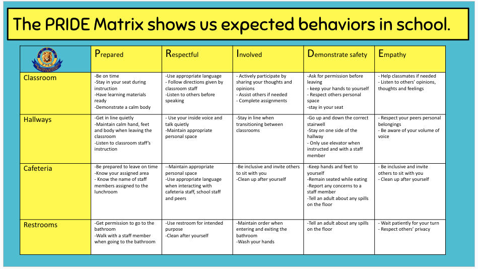 Where should we follow the PRIDE Matrix in school? In the classroom and where else?