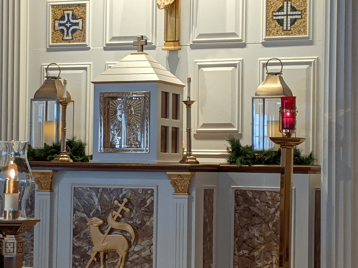 This is lit to tell us that Jesus is present in the Eucharist in the tabernacle.